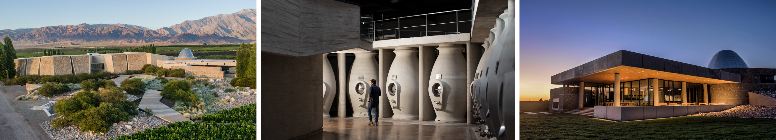 Diseñada para realizar microvinificaciones de cada tipo de suelo, la bodega utiliza el concreto como material principal, un material natural que permite fermentar y criar los vinos en contacto con materiales naturales provenientes de la tierra y el agua del lugar, como parte de la búsqueda por interpretar con fidelidad la identidad del Valle de Uco.